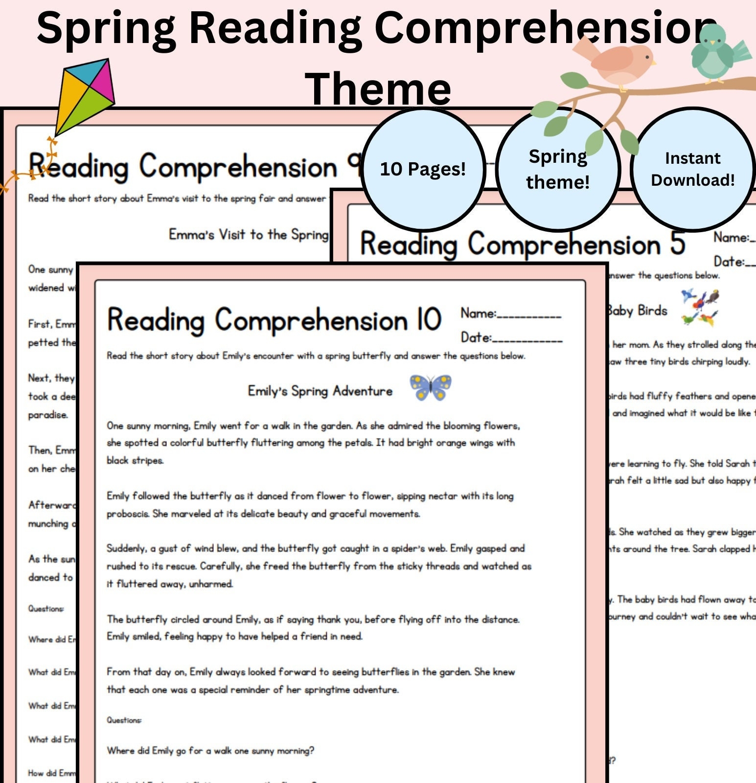 10 Spring Theme Reading Comprehension Worksheet First Grade Second Grade Reading Passages Instant Download PDF Spring Learning Etsy UK