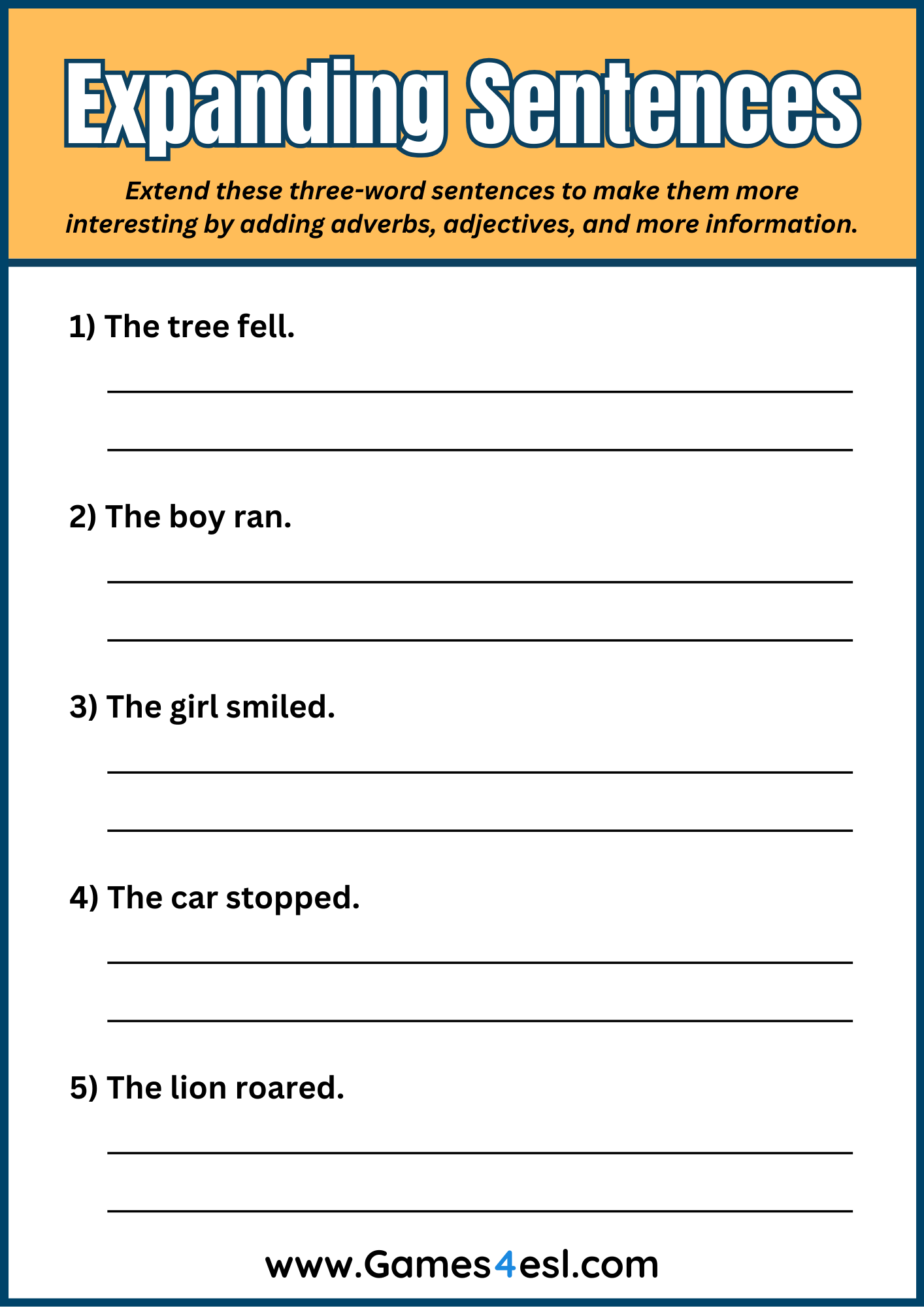 With these worksheets, kids can practice expanding simple sentences into more detailed and descriptive ones. This not only helps them enhance their writing skills but also boosts their creativity and vocabulary. Plus, it’s a great way to keep them entertained while learning!