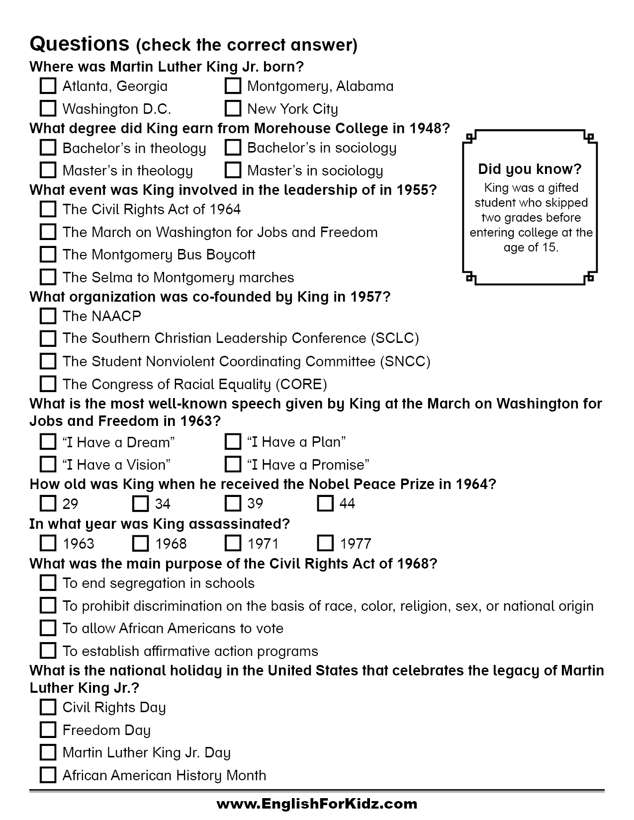 If you’re looking for a fun way to improve reading skills, look no further than the MLK Reading Comprehension Worksheet. This engaging activity helps students learn about the life and legacy of Dr. Martin Luther King Jr.